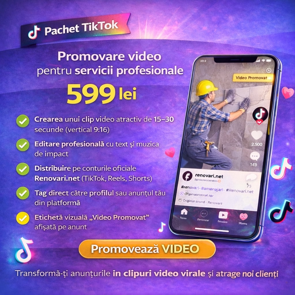 Prin acest pachet TikTok promovare video servicii, echipa Renovari.net creează un videoclip atractiv, adaptat platformelor sociale actuale, și îl publică pe canalele oficiale Renovari.net, oferind vizibilitate suplimentară anunțului sau profilului tău.